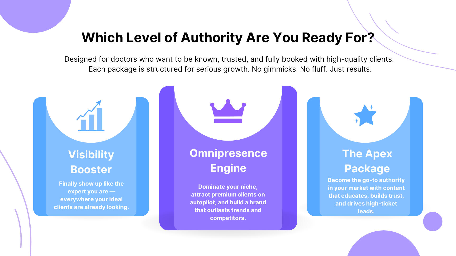 …and start becoming the trusted voice in your industry.When you dominate attention with smart content and omnipresence, you don't compete — you lead.You become the doctor people feel like they already know before they ever meet you.
